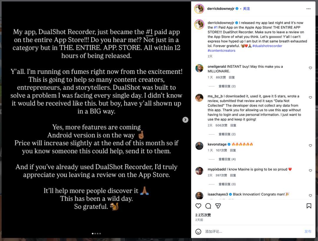 三天前,Derrick Downey Jr 在 Instagram 上发布了一条视频介绍他刚刚发布的应用。