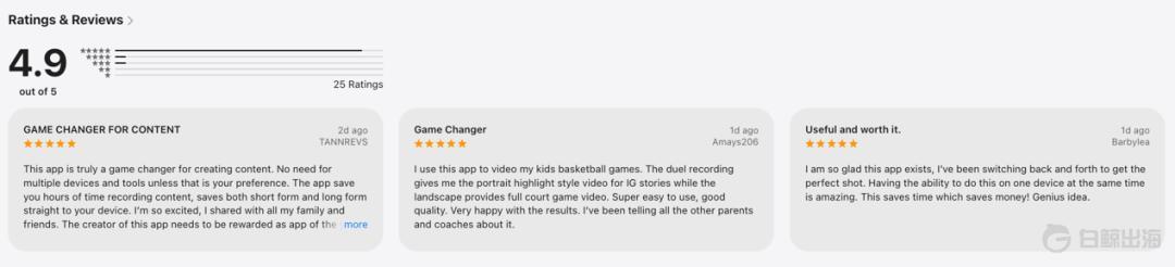 在目前 AppStore 前台显示的 25 个评分中,「DualShot Recorder」拿到了 4.9 分的高分评价。